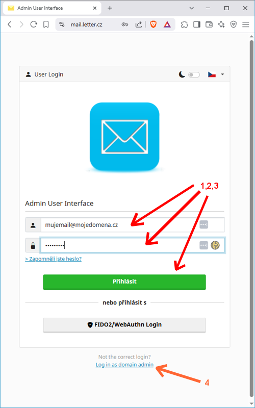 pozn. v případě, že jste správce domény (v tomto případě doporučujeme, z bezpečnostních důvodů, zabezpečit administrativní účet dvoufaktorovou autentizací), přistupujete ke konfiguračnímu rozhraní správy uživatelů prostřednictvím administrativního účtu k doméně na alternativní URL adrese, viz. položka (4) „Log In as domain admin“. Autentizací administrátora otevřete rozhraní pro správu objektů domény - nastavení doručování pošty - Filtr spamu - váhy spamu, definování blacklistů a dalších individuálních uživatelských nastavení neměňte, pokud si dobře neuvědomujete dopady těchto změn. V případě nekorektního nastavení můžete zapříčinit částečné, nebo úplné přerušení funkčnosti doručování emailu do vašeho(šich) účtu(ů).