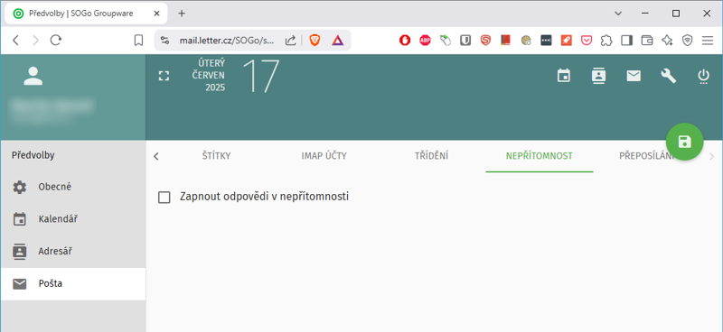 - přeposílání - volba pro automatické předávání doručené pošty paralelně na další adresu(-y).